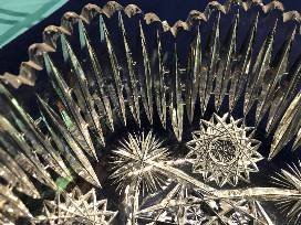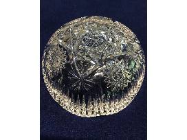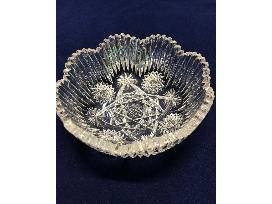 One of the top spires is chipped--see photo. Bowl reportedly a "Hobston Flashstar, notched miter. Valued at $300 in 2005 by a knowledgeable collector.