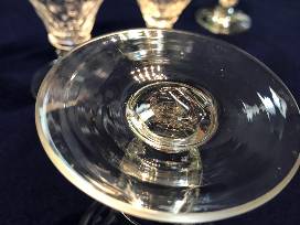 Two hand blown and two machine made hand etched grape patterned goblets. The punt mark is evident on two of them indicating they were made by hand.