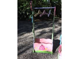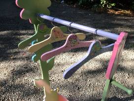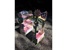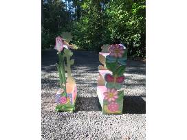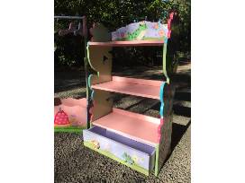 Both are carved and painted in a whimsical flower garden theme. The wardrobe comes with four painted hangers to match. The bookcase has a small drawer at the bottom for storage and wall anchor points at the top to prevent tip-over. Five years old, in very good condition, they've been a cheerful addition to our child's room!