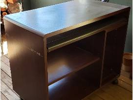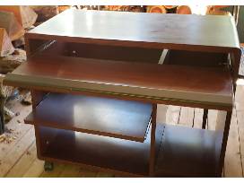 Specifications: Full-width computer tray, one adjustable roll-out shelf, one narrow shelf, casters. Scratch on the side, small scratch on top.