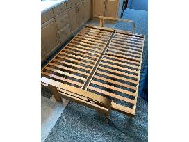 0Wood Frame Sofa/Bed w Futon Condition: Used - Good Full-size futon with wood frame that converts from bed to sofa. Frame measures 80 inches long and is in great shape. Futon is well used and covering has some wear. Fits full-size bedding. Will require minor assembly. Length: 80 in. Width: 55 in. Height: 11 in.Specifications: Frame is designed to require only one user to covert