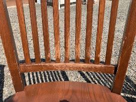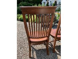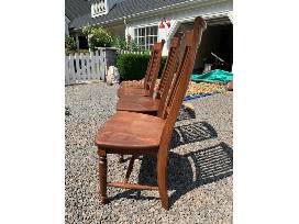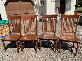 Four solid wood dining chairs. Sturdy, comfortable with some scratches on the finishing. I believe they are made of oak. Length: 17.5 in. Width: 20.5 in. Height: 42 in.Specifications: The scratches are primarily on the seat and lower backrest. The photo of the lower backrest posted here has the most scratches of all of the chairs. (From a formerly attached booster seat.)