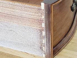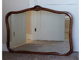 Cherry veneers and solid hardwoods.. Curved drawer fronts. Dovetail drawers. Very nice condition. Small mars on the top, but hard to capture in a photo as the light has to be just right to see them. 62" wide; 20" deep; 33" tall. Framed mirror to match. 46" wide; 34" tall. Sold/priced as a set.