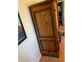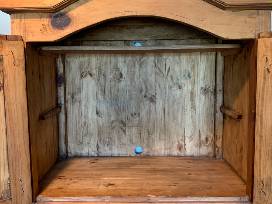 Iron hardware and hinges. Shelf in upper cabinet. Cord holes in the back. Two drawers.