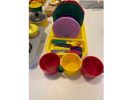 Children's play kitchen with toy plates, pots, pans and other misc cooking toys.