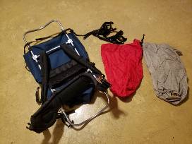 Metal frame backpack with two bags for storage or tying food in the trees. A couple of ties to attach a sleeping bag or pad are included.