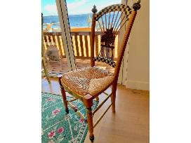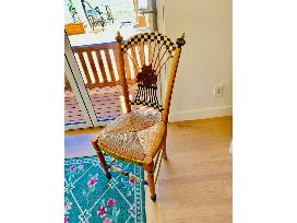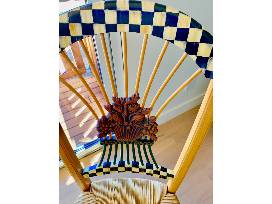 An original, designed and manufactured by the whimsical furniture and decor retailers MacKenzie and Childs. Rush woven seat, Courtly Check Top back. Flower Basket center back.