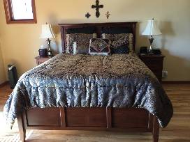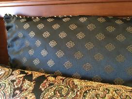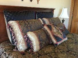 Chris Madden JCPenney Home bedding set. Polyester covers. Multi-color: gray/green, rust, black, beige. Includes: bedspread, 2 European pillow shams including fresh pillows, 3 throw pillows, 2 standard size shams/no pillows, and dust ruffle that matches the European shams. Specifications: Polyester bed comforter is washable.