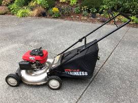 Honda engine, 21" stainless deck gas mower by MDT. Starts easily. Runs well.