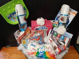 Snow Day Fun Basket, contains a Sno-fling It snowball maker, Sno-shovel, Sno-digger, Snow brick maker, 2 Hydroslide sledding mats, 3 HotHands hand warmers, 2 HotHands toe warmers, Mini Sno-markers, Betty Crocker Hot Fudge Brownie Mug Treats, Jet-puffed mini marshmallows, Swiss Miss hot cocoa mix, Decorate a Snowman kit