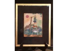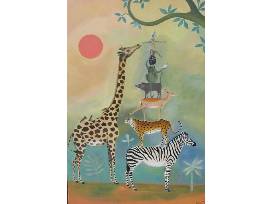 This is a framed and matted print of an original acrylic painting - a whimsical a portrayal of African animals including a giraffe, zebra and other animals by British artist Julia Cairns who spent many years living in Africa.