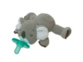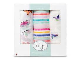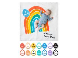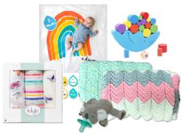 Basket includes 2 Hand Crotched Baby Blankets, Lulujo bamboo cotton blend swaddling blankets, Lulujo baby's first year blanket with rainbow backdrop and milestone cards, Wubbanub Koala pacifier and Moon Block Balancing Game