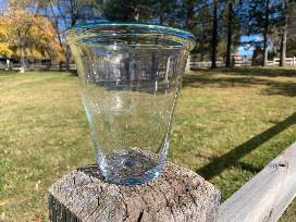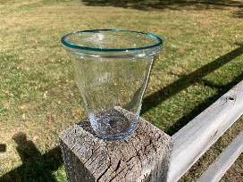 This brilliant clear glass vase features a subtle, thin blue rim. Imagine it on your serving table filled with nuts, berries or other tasty treats. Handmade by Boden Hart '22.