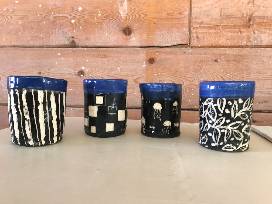 Enjoy your favorite beverage in these creatively handmade cups from the Ceramics Service Crew! Each mug has a unique design. This set was crafted by Betsy Bingham-Johns, Lila Russell '25, Grace Hassell '25, and Emma Roberts '24.