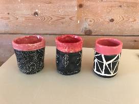 Enjoy your favorite beverage in these creatively handmade cups from the Ceramics Service Crew! Each mug has a unique design. This set was crafted by Lila Russell '25, Emma Roberts '24.