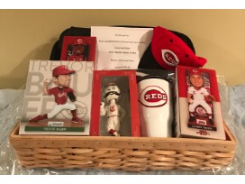 Fleece Reds blanket, Ball cap size medium, Joey Votto stretchy arm sleeve, Reds lanyard, Mr. Red bobblehead, Trevor Bauer bobblehead, Johnny Bench bobblehead, Ken Griffey Jr. bobblehead, Woven basket with leather handles