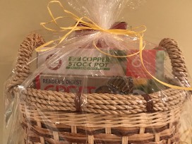 White Serving tray with copper handles and ceramic porcelain finish, 2.6 quart copper coated stock pot, charbroil gas table top grill, 11 piece BBQ tool set, Readers Digest Great Recipes Book