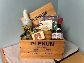 Includes: Monte Pollina Roasted Garlic pasta sauce, Alta Ville Scrivia Italian Artisan durum wheat pasta, Olive Tapenade, Marinated Artichokes, Rosemary & Cracked Pepper crisps, Wisconsin cheese selection, Nonna Ada Milk and Coffee Biscotti, a bottle of Fritz 2009 Vintage Late Harvest Zinfandel, a bottle of Plenum Secundus wine, and two Nevins Inc 60th Anniversary wine glasses.