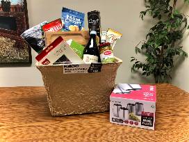 Includes: a charcuterie board, a bottle of wine, 4 wine tumblers, wine glass markers, a marble cheese cutter, a selection of crackers, sausage, and two Nevins Inc 60th Anniversary wine glasses.