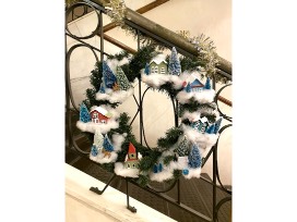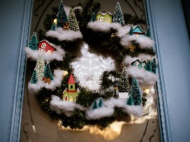 Enjoy a nostalgic winter scene with a wreath studded with vintage, Putz-style houses and bottle-brush trees. Staying at home isn't so bad with these cozy little houses to imagine yourself in.
