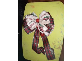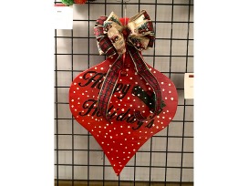 A Christmas truck carries a Christmas tree on this painted wood ornament, complete with a delightful bow with bells..