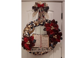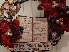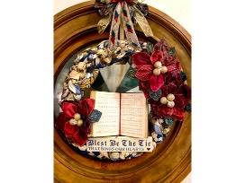 This vintage tie wreath was designed around a well-admired hymn of the past, "Blest Be The Tie That Binds." Written by John Fawcett, this piece encourages us to bind our hearts together in loving expectation as we bring courage, hope, fellowship and prayer to one another and tie ourselves as humans with God our comforter through all eternity.