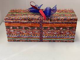 The Paolo Soleri windbell is designed with a highly variable color pattern that ranges from green to turquoise with metalic bronze highlights. An acrylic spray coating completes the finish making it resistant to oxidation over time. Dimensions of the bell and assemblage is 22" long with the bell 5" wide. These popular windbells from Soleri are sold in museums and gift shops throughout the United States and the world.