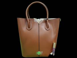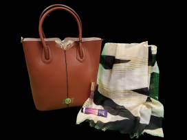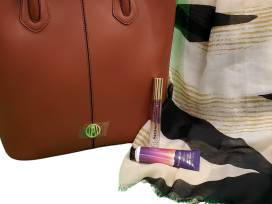 This sophisticated, saddle-color leather tote is perfect for the woman on the go. The tulip shape gold accent gives the handbag its name. This package also includes a scarf, and Bath & Body Works Sunset Glow perfume spray and hand cream.