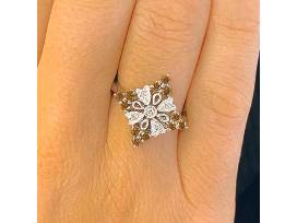 These diamonds are set into a snowflake pattern with open filigree in the center. This ring weighs 4.4 grams.