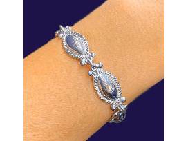 Completing the ensemble is a 925 sterling silver toggle bracelet featuring six marquise shaped links. Each link has a high polish center with a rope style border.