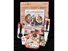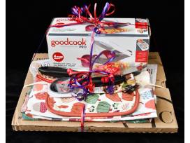 Includes coordinating oven mitts and kitchen towel, Everyday Living pizza slicer and server, and Good Cooks vegetable chopper. All wrapped up for a beautiful gift presentation.