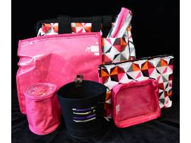 This versatile bag offers lots of storage and easy access with a zippered top, various sized outside pockets. Includes several color-coordinated zippered storage pouches in various sizes.