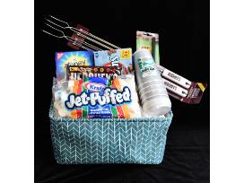 Gift basket containing campfire kit ready to make your own s'mores - marshmallows, chocolate bars, graham crackers, toaster forks, lidded cups and a lighter!