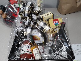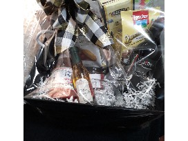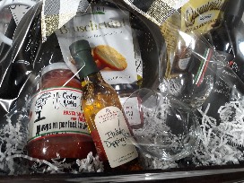 A scrumptious assortment of kitchen essentials, snacks and Italian food favorites complemented by wine and a pair of wine glasses! Packaged in a woven fabric and wire basket.