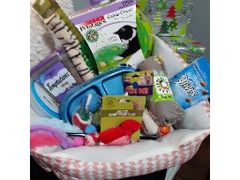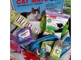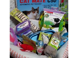 A great assortment of feline fun! This package includes treats, toys and other cat supplies- as well as Cat Mate C50 feeder! This feeder ensures fresh meals to be reliably served at the correct time, automatically to your cat- whereto you are working late or away for a weekend! Food is kept fresh in five easy-clean compartments by a rating lid and refrigerated by twin icepacks. Just set the batter-operated timer to the required meal times!