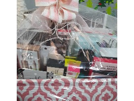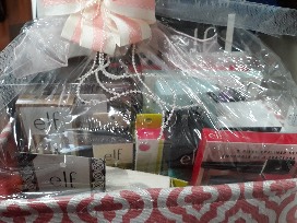 What a great gift idea- or something to spoil yourself with! This big basket contains a huge variety of cosmetic items in a canvas tote with rope handles.