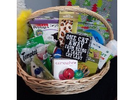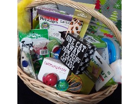 A great assortment of fun filled feline supplies, treats and toys- including a Catmosphere treat ball, a catnip chaser toy and a Pawscout pet ID tag.
