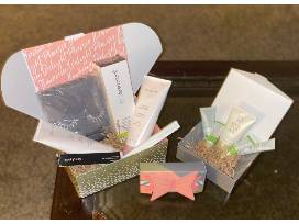 Includes New unlimited lip gloss, city scape carry and go perfume, body wash and lotion, activated charcoal mask with towel, satin lips set and mini satin hands set.