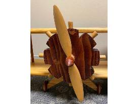 Handmade airplane bookshelf with tan and dark wood propellers.