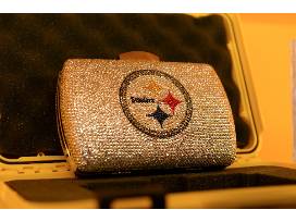 Pittsburgh Steelers Purse adorned with approximately 4,000 Genuine Swarovski crystals from Austria, Handmade in the USA. Includes 8 LED collectible case with rotating turntable, yellow storage case and certificate of Authenticity with NFL & Swarovski holograms.