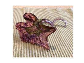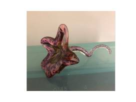 A hand blown glass flower, donated by the RIT Community Relations and Special Events department. 5" x 3-1/2"