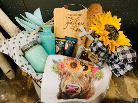 This darling basket of kitchen goodies is sure to brighten up any kitchen! Basket features