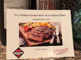 - Six Certified Hereford Beef 14 oz Ribeye Steaks (Shipped directly to you) ($210 gift certificate)