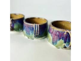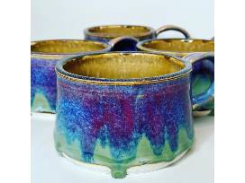 Four hand-made wheel-thrown stoneware mugs. Drippy purple and blue glaze float over a green base. This thoughtful design couples solid mugs with light handles delivering a beautiful and functional cup of joe! Color cannot be properly conveyed in photos.