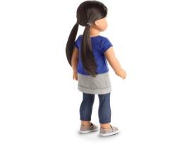 The 18" Z doll has warm brown eyes that open and close, and a beauty mark on her left cheek. Her dark-brown hair can be brushed and styled. She has a huggable cloth body, and her movable head and limbs are made of smooth vinyl. She comes with The Real Z paperback book, plus a fun camera-ready outfit: