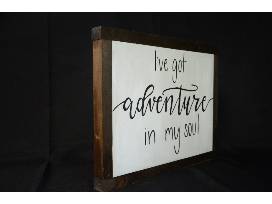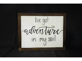 This handmade sign by Sawdust Souls features "I've got adventure in my soul". Dimensions approx. 3'wx2'h.