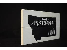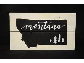 Hand painted sign featuring outline of Montana and trees. Done with love by Sawdust Souls.