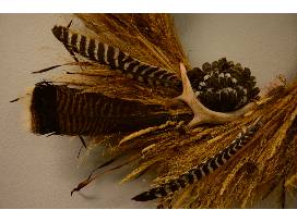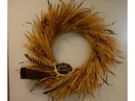 Handmade wreath by local artist, Julie Beebee. Features natural elements, antler, turkey and blue grouse feathers that are sure to flatter your Montana home.