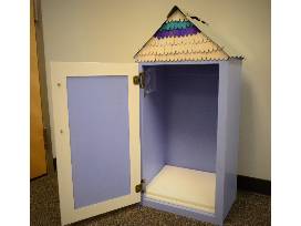 Free Library box made from repurposed materials. Metal roof. Two shelves
