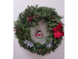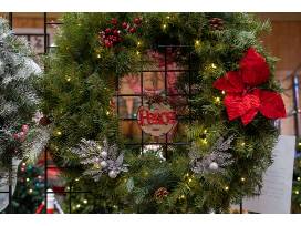 Included--Battery-operated, lighted 32" wreath with decorations and gifts: